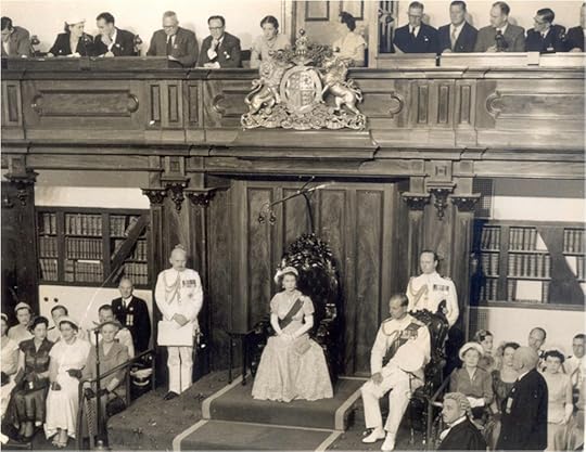 The morning of 12 January saw the Queen and Duke up bright and early to travel to Athletic Park to attend a Children’s Gathering. 35,000 children and parents greeted the royal duo with boisterous cheering and the waving of Union Jack and New Zealand flags. The royal couple proceeded in an open Land Rover down through the lines of excited children. In the afternoon, Her Majesty presided over the “Royal Opening” of a special session of the New Zealand Parliament in the Legislative Chamber. For this historic occasion, she wore her dazzling Kokoshnik diamond tiara and Coronation dress. The Duke wore the uniform of an Admiral of the Fleet. Two new painted throne chairs, each covered in red brocade and featuring a fern motif, had been made in Christchurch by cabinet maker Charles McCracken out of Southland Beech especially for the ceremony. The Queen’s chair was emblazoned with her personal cipher of EIIR. Her Majesty acknowledged in her speech that the ‘bountiful lands’ of New Zealand had ‘grown to be a Sovereign and a mature state.’ That evening, Her Majesty held an investiture in Wellington Town Hall. 150 men and women received civil and military awards.