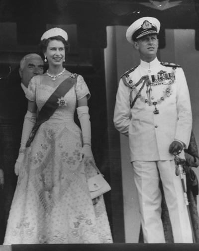 On the first day of the visit to Tasmania Her Majesty and the Duke were greeted by a small flotilla of local sailing craft and crowds at Battery Point as they sailed down the River Derwent to their ship’s berth at Prince’s Wharf. After settling-in at Government House, the royal couple undertook a series of engagements which included a Children’s Rally at the North Hobart Oval, a visit to the Repatriation General Hospital for Servicemen, followed by a commemorative tree-planting at Anglesea Barracks. Her Majesty then unveiled a Sesquicentenary Memorial at Victoria Dock watched over by a crowd of 10,000. This monument commemorates the founding of Hobart in February 1804 by Lieut.-Colonel David Collins of the Royal Marines. In the evening, the royal duo were the guests of honour at a State Reception at the City Hall. The following morning, the royal party attended the Sunday service at St David’s Cathedral, the rest of the day being left free to allow for some rest and recuperation. 22 February, however, brought forth a busy schedule: the Queen opened Parliament, held an investiture which lasted some thirty minutes, attended the third Royal Garden Party of the royal tour at Government House and presided over a State Ball at City Hall. For this occasion, Her Majesty wore a gown of lilac organdie offset by a sapphire and diamond necklace, a diamond bow brooch and Queen Alexandra’s tiara.