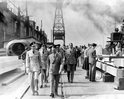 After a brief stopover in New York, the Duke of Kent travelled onwards to stay with President and Mrs Roosevelt at their private Springwood estate, at Hyde Park, situated on the eastern shore of the Hudson River, some four miles north of Poughkeepsie. The Prince’s host took him on a tour of the new Franklyn Roosevelt Library and was keen to ensure that his royal visitor viewed an eclectic selection of the exhibits. A ‘highlight’ was the chance for a royal dip in the Roosevelt’s private swimming pool. The Duke and the President then travelled by rail together overnight to Washington D.C., arriving on the morning of Monday, 25 August. The Duke and his party then spent the rest of the day in Virginia visiting an operational unit at Langley Air Force Base, as well as touring the Navy Yard at Norfolk which was currently being expanded to better supply the combat ships that were required. At the latter he was greeted in person by Admiral Manley H. Simons, District Commander of the 5th Naval District. His Royal Highness returned to Washington to spend an overnight at the White House. A dinner was held there in Prince George’s honour (attended by eighteen guests who included his kinsman, Dickie Mountbatten and Harry Hopkins, who frequently travelled to Britain as Roosevelt’s “envoy”). That the President and the Duke of Kent had managed to spend some “quality” time together was seen as advantageous to the British cause, for with the United States not yet having entered the Second World War, the King and Churchill had been particularly anxious to sustain the “special relationship” between Britain and its long-time ally.