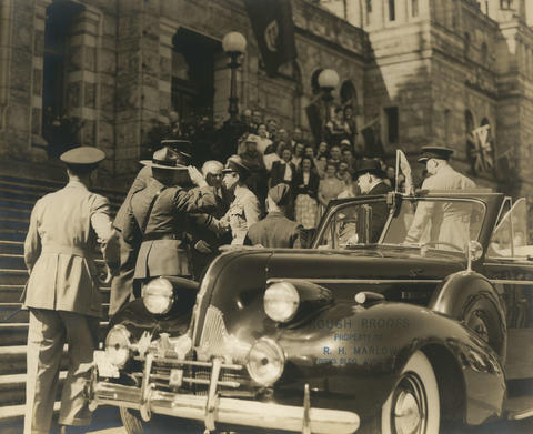 Duke of Kent tours Boeing aircraft plant near Vancouver August 1941Thereafter, on 10 August, Prince George motored to nearby Vancouver, to undertake a tour of Burrard Dry Dock where Bangor Class Minesweepers were being built for the Royal Canadian Navy. His Royal Highness also toured the neighbouring North Van Ship Repair Yard, which had just been re-tooled so as to construct minesweepers, at the behest of the Canadian government. Three new launch ways had recently been built at this site and the Duke was given ample opportunity to inspect the facilities. It is clear from local photo archives that His Royal Highness made time to speak to many of the shipyard workers, as well as some war veterans from World War I. It so happened that the Prince was keen on naval history (having previously served in the Royal Navy as a midshipman) and he was Patron of the Society for Nautical Research. Prince George also met with patients at the recently-built Shaughnessy Military Hospital in Oak Street. News of his visit soon reached locals and as he prepared to depart in his open-topped official limousine, he was surrounded by a large crowd. Thereafter, the Duke made a short visit to Jasper in Alberta where he dined privately with Charles E Hughes, a retired Chief Justice in the United States.