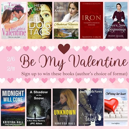 The Be My Valentine Giveaway runs 2/6 through 2/11. The 1st place winner will receive all ten books (authors’ choice of format) and the 2nd place winner will receive three books (authors’ choice of format) of their choosing. A variety of genres, from fantasy to historical romance to suspense and more, are featured.