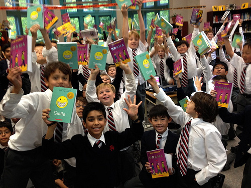 Dave snuck this photo of six kids reading SMILE at a school in Oakland