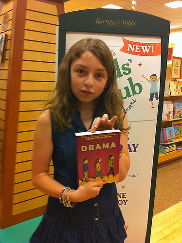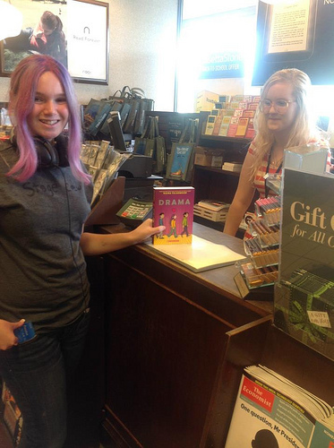 And…I had one more entry that I just couldn’t resist awarding a runner-up prize to. I know the contest was to take a photo, in a store, of yourself buying Drama…but I got an entry from Alysa Matsunaga, whom I met at the Decatur Book Festival, and it was too excellent to resist: