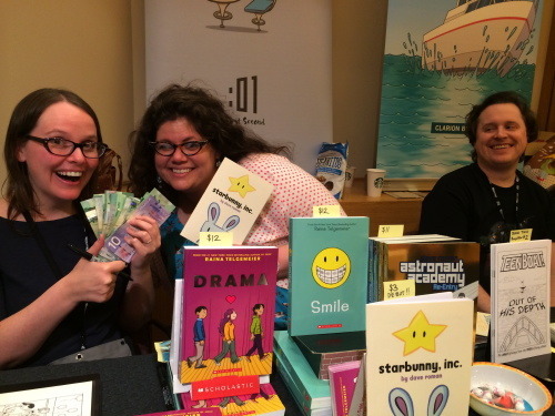 AND, I’ll be tabling with Dave at Artist Alley Booth #2120! This is where you can find me anytime I’m not scheduled to be somewhere else. (Although I might have a sandwich in my face.) Come to our AA table for signed copies of Smile and Drama, original art, and Smile t-shirts (which will be back in the site store in July when we’re back from the conference)! Dave will have new Astronaut Academy t-shirts, and copies of his brand-new webseries, Starbunny, Inc. too – come get one and get in on the ground floor!