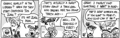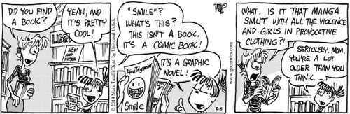 So a couple of weeks ago, I got a neat surprise: Mark Tatulli, who is best known as the creator of the syndicated comic strips Lio and Heart of the City, decided to write a week’s worth of HotC basically celebrating Smile and the awesomeness of graphic novels in general. Here are the strips: