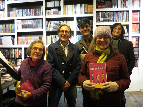 With the store’s owners, Samuel and Jean-Philippe, and Samuel’s mom, Jeanette! Can you see how the store’s shelves are made to look like comic book pages?