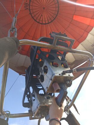Балонът се издигна на 15-тина метра във въздуха като едно от момчетата го държеше с дебело въже. Оказа се, че понеже съм резервирала ВИП полет имах право да поканя още един човек. Поканихме няколко от новодошлите, но те не пожелаха да опитат. Свързах се с моя приятелка, но въпреки огромното желание, не успя да се включи. Реших, че щом съм стигнала дотук връщане назад няма. Успокоиха ме, че в цената влизала и бутилка шампанско.