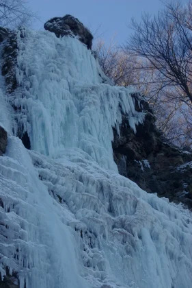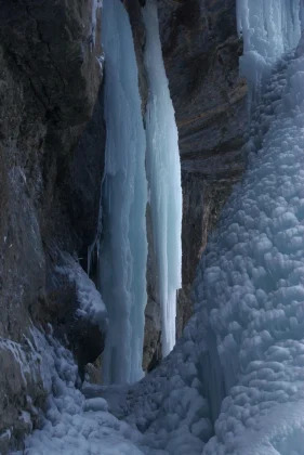 Гигантските ледени кули и висулки се извисяват на 63 метра, следвайки отвесната скала, по която в хубаво време се спуска водата.