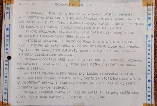 „Тръгвай с мен”. И другарят Матеев ме отведе в апаратната, където новините излизаха на секундата, така както топлият хляб излиза от фурната. Прекарах там доста време. И ето първият телекс – „Еверест-84” на път към върха.“ Зачаках с трепет. Новината не закъсня – „МЪЛНИЯ”. (б.р. означение за много важно съобщение)