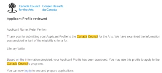 In other Canada-related news, I was delighted to be approved by the Canada Council for the Arts as a literary writer.
