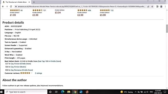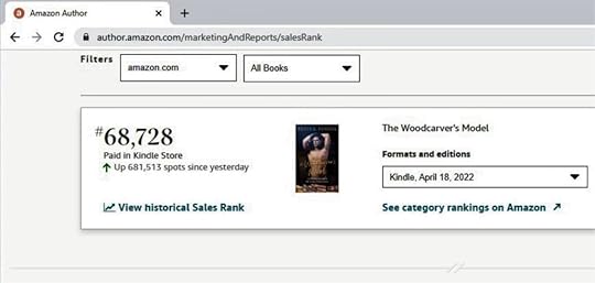 Authors can go to their Amazon page for the book and track the ranking the algorithm is showing for any book by simply putting in the title. There are three major markets; the European market (mostly represented by the U.K.), the U.S. market (Amazon.com) and in this case, the Canadian market (which is much smaller). There are of course other markets the book is released in, but in markets where the primary language is not English, the numbers will be very small indeed as at present The Woodcarver’s Model is only available in English.