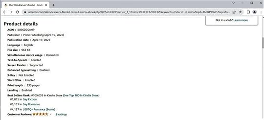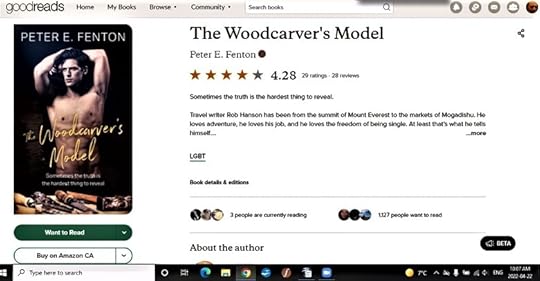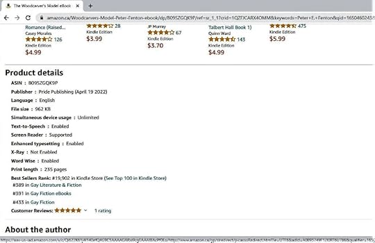 At end of day on April 19th, The Woodcarver’s Model was at #109, 039 on the Best Sellers Rank, #1815 in Gay Fiction, #3151 in Gay Romance and #4157 in LGBTQ+Romance in Books. It is important to note that while the first number is generally calculated using ALL books out there, the numbers by category are only defined by how many books there are in that category, a number that shifts daily based on new releases. So it is challenging to know if it is a large or small field. In a smaller field, a sale of 30 books could make a book jump up a substantial amount if many of the books in the field have been out for some time and aren’t active sellers at the moment. And while these numbers are fun to look at (and the publisher DOES look at these numbers with great interest) the position of a book is related to many other factors, and during the life of the publication, the numbers will go up and down like a yo-yo (hopefully more up than down).