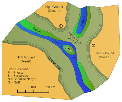 The scenario begins when the group of priests crests one bank of the river (Point P), and the sorceress' group crests another bank (Point S), and for the first time they have the potential for conflict.