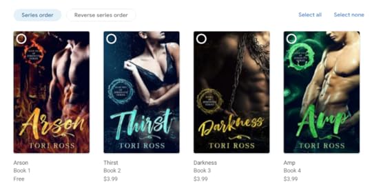 For example, for my Jensen City Heroes series, you can get Arson FREE, buy Thirst at regular price of $3.99 and then get Darkness and Amp 20% off the regular price.