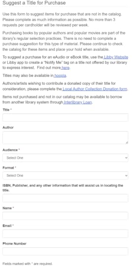 #3 – Go to your library’s website and search for something like, “Suggest a Purchase.” This is what my library’s page to fill out looks like: