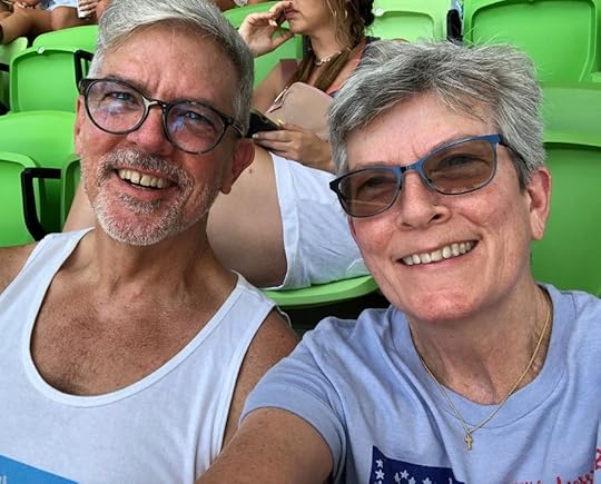 Later, a young woman moved to the back of the floor area where there were no chairs and danced to the music, alone. A young man in cowboy boots and a straw hat apparently took it upon himself to rescue her from her solitary celebration and raced across the open zone, skidding to a halt in front of her, boots sliding on the protective flooring laid on the soccer field. He placed the two beers he carried on the ground, then leaped to take her in his arms. She happily complied with his twirls and spins, following his lead as they danced together to the sounds of guitars and a harmonica. When the song ended, he gave her a short bow, collected his beers, and returned to his seat. Duty done, problem solved. Made me smile.