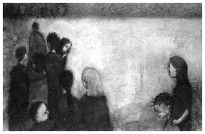 A first funeral - at six, the idea is beyond digestion, an aerial view from her mother's shoulders of the devastation below. She has no emotional ties or any age, truly, to know what she is seeing: a collage of photos of a happy man fishing, a photo with his wife. A scene before her, in human form, a mother's hand on her crying son's shoulder. All he can feel is the vastness of the room, its vacancy of color, the darkness of black ties and tights and tight-lipped apologies for loss.