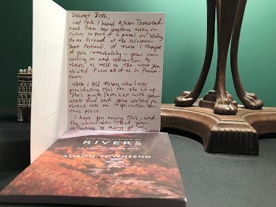 I did. And here from our beloved Juncture friend (read her words in the sidebar here) was a beautiful card, a startling note, a book called RIVERS by Alison Townsend. Out in Wisconsin, Jessica had heard Alison read. Knowing my own obsession with rivers, my FLOW, Jessica had bought me Alison's book. Alison, as it turns out, knew something about me, a circle was drawn, a beginning touching an end touching a beginning, and flowing forward through our Jessica.