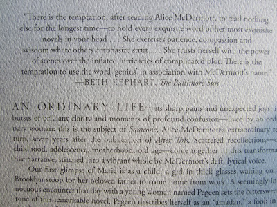 And so I got a copy of Someone, Alice's seventh novel. And so I slipped it into my bag. And so I walked the floor and sat with Jen Doll and met the wonderful Chronicle team and then left the event to find my son and sit with him in a place called Tracks. And then I rode two trains, and it wasn't until I was three stops from home that I took Someone out of my bag and held it to my heart and then (the way we do) slowly turned it over to read the jacket copy.