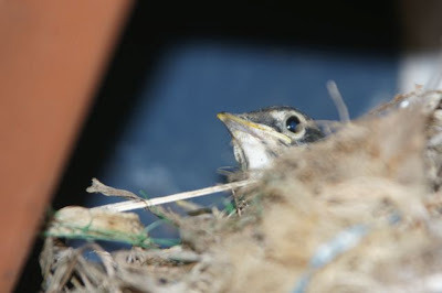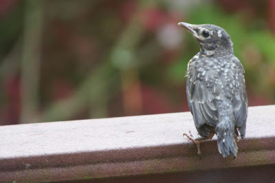 From the nest to the porch railing. A wild flutter of wings, and then up onto a thin branch of the Japanese maple. Five minutes later I found it out back.