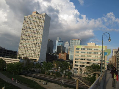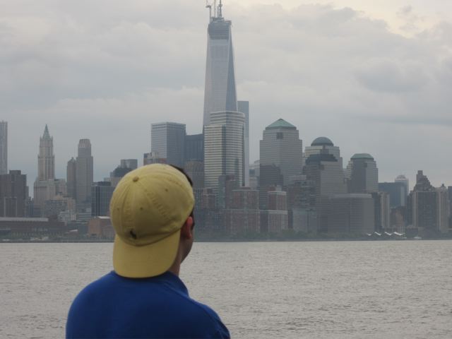 We arrived just ahead of a massive storm. Ran through thinning rain drops. Settled down, then walked some more, and last night had a meal at a restaurant of his choosing. I took this photograph just as the storm was lifting. That's the Freedom Tower, fast becoming the western hemisphere's tallest building.