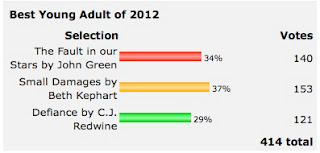This is sort of amazing to me (sort of! who am I kidding?) but Small Damages has just been named to the Armchair BEA Central Best of 2012 list, along with The Fault in our Stars and Defiance. I'm pretty darned sure this is the first time my book has ever been mentioned in the same breath as the work of John Green or CJ Redwine, and, well, yes, of course I'm the gonzo underdog here, but...> It would be so cool if you voted. It just would be so cool.