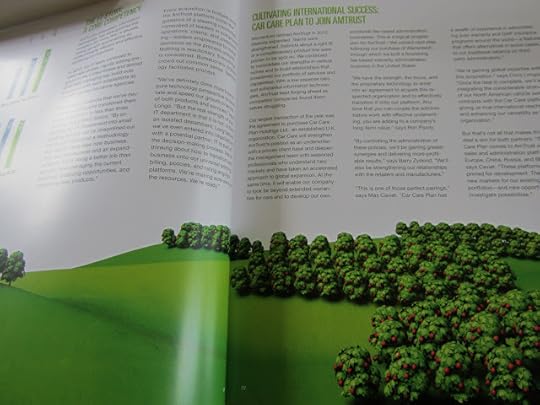 The best projects are those that afford me the chance to collaborate with my artist husband, William Sulit (who also illustrated Dr. Radway's Sarsaparilla Resolvent, which will launch next Tuesday). Over the last several years, our biggest collaboration has come on behalf of AmTrust Financial Services, Inc., a hugely successful niche insurance company operating in countries all around the world. I travel to Wall Street, spend time with the company's leaders, suggest themes, interview, write. My husband turns the written stories into visual ones. This year, he used his 3-D illustration talents to produce a beautiful, several-page series.