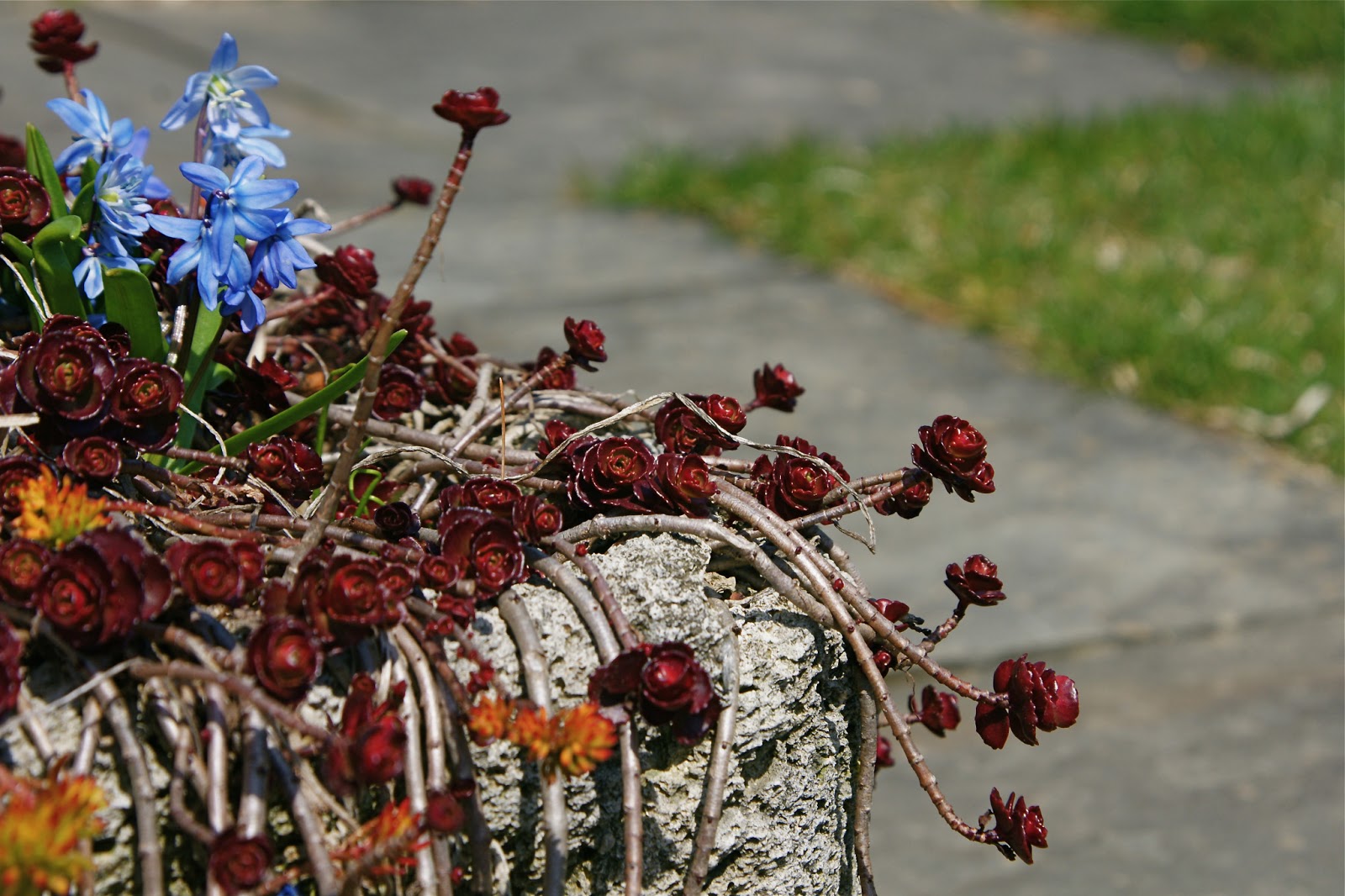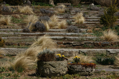 If you came here just for the pictures, here they are—Chanticleer Garden, April 7, 2013, a brand new season of color and verve. The secret garden elves have spent the winter widening paths, planting pots, putting the start of lettuce into rows. They have had a ball with succulents. And the big bright fish are alive.