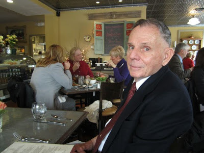 Yesterday was a celebration of my father on his birthday—a surprise cake among his many friends at his church, a lunch at his favorite, cafe, a somewhat disorderly assemblage of preferred foods from the Farmers' Market, organized into sub-specialty themes (here we have our cheeses and crackers, here our apple fritters, here our quiche, here our pecan pie), tickets to an upcoming high school production of Grease.