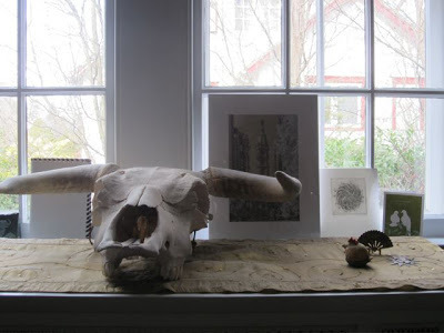 Every day now, on the way to my client work, I will walk past this windowsill. To the left, the leather book I made in a workshop in Florence; the leather master is a character in my book. Just past the Santa Fe skull, the gift my son gave me for Christmas—his favorite view of Philadelphia, our shared city, set down by a local artist. Beside that, a glorious etching bought for me by my friend Alyson Hagy. Complexity, she says, she favors, she sees. Which is never the same as complication.