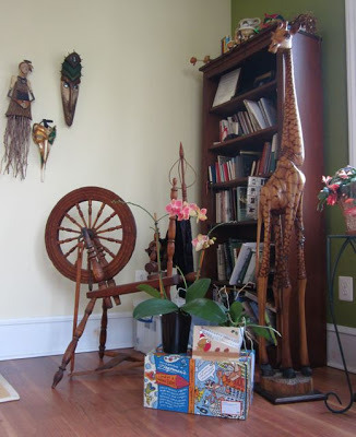 Today, with the rain and the dark, with Christmas done and the next big cooking event a day or two off, I walked past the piles of others' books that have accumulated here the past few weeks, ignored client work, didn't dust, and slipped inside my office. My muses live here—a fabric doll from Asheville, a mask from San Miguel, a collection of painted faces from Venice, an African giraffe, an old spinning wheel, my books of poems, a box from Tamra. My Florence novel, half written in a fury since October, has been frozen on my desktop since early December.