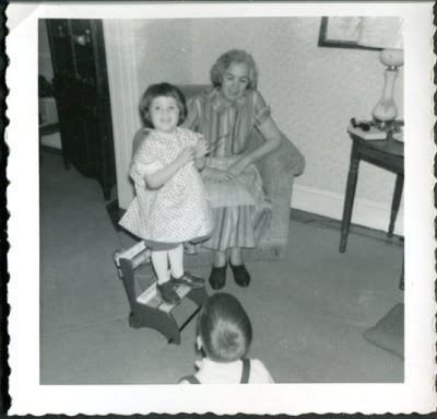 Here I am with Grandmom and my brother. I'm two years old, standing proudly on my new stool, a Christmas gift. I scanned this photo this morning from the wooden album my father gave me to after my own mother passed away.
