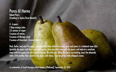 Tonight I'll officially launch Small Damages (Philomel) in my hometown library. I'll be sharing images of the research process, snapshots of Spain, and a glimpse of my Estela's cortijo kitchen. I'll also be giving those who come this recipe card, featuring one of Estela's favorite easy desserts. Now, Estela is Estela, and pears are pears—so many different textures, so many degrees of firm. You have to mess with temperature and timing, therefore, but if you wait until the pears are truly cooked through, you'll have a sensational little treat on your hands (plumped raisins, Malaga- and orange-flavored pear flesh).