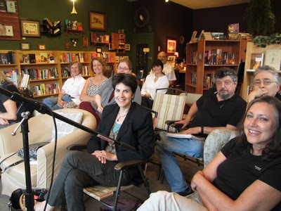 And in The Wise Owl Bookstore, an independent as adorable as they come, shop owner Kira makes room for special events created by the very special Sue Lange (pictured front and center). Yesterday was open mike day, and I was there, aligned with other writers and readers, for a memorable evening of stories and talk. Teresa, my kick-butt combat teacher, stopped by. A tawny cat slinked beneath chairs. Stuffed owls hung suspended in time. And that left elbow in the front row? It belongs to none other than the fabulous A.S. King. (It's not that my camera neglected King, by the way. It's that she ducked.)