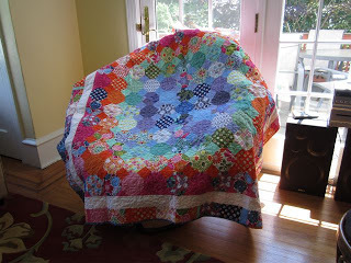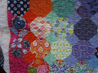 Look at this quilt!!! Look at the colors, the care. "Use it!" she kept saying, when I phoned her just now to say (fumbling for words, breathless) thank you. But how can I? How could anyone? This is art and it belongs on a wall. This is an extraordinary gesture of friendship. This is color interwoven with love.