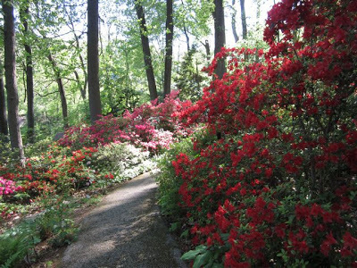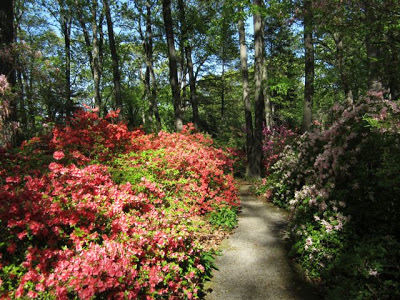 There comes a time when all you want to do—all, indeed, you can do—is walk a sacred place with a friend. This afternoon, I traveled here with dear N.H. and we walked—down around the pond, up into the color, in between the innumerable azalea bushes of Jenkins Arboretum.