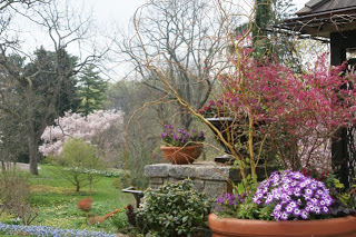 Profoundly exhausted, I wasn't sure that I'd make it this year. I was glad I found a way. The skies were gray but not storming when I arrived. The daffodils and cherry trees had bloomed out early, as was this eager season's way. Still, purple and blue electrified the landscape. The neon koi were in their pond. The pots were brimming.