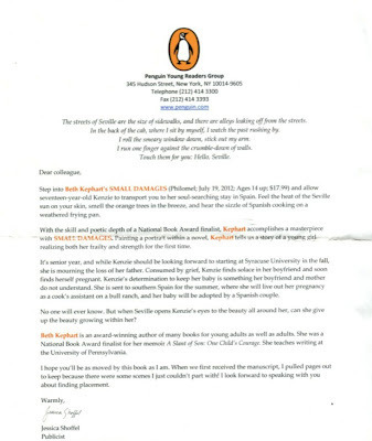 But yesterday, while chatting with the utterly delightful Jessica Shoffel (a Penguin publicist) about many things, she stopped and glanced toward a corner of her office, where she said the ARCS of SMALL DAMAGES were piled. Oh and by the way, she said, here's the letter that I'm sending out with your book.