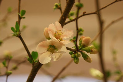 For an exhibit of the extraordinary furniture and furnishings made by the gardeners of Chanticleer, Jonathan, a gardener I have always loved, forced, among other things, quince. So that it bloomed today among the many admirers at the Wayne Art Center. It bloomed, a centerpiece in a room of art among people who love growing things.