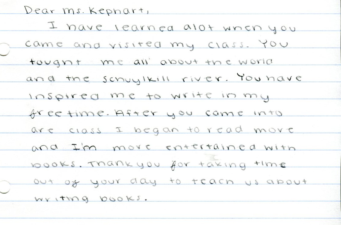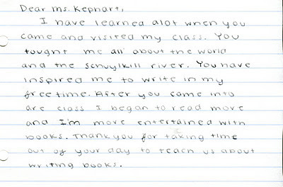I'd visited Mrs. Skrzat's classroom at The Eighth Grade Center at Springford just before I'd left for London. I'd sat in a classroom talking about what we believe in, what we write, what we reach for, how we live. And then, in a mad fury, I had dashed off. Not forgetting those dear students—I never do that. But imagining that they would soon forget me.