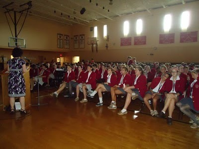 This beautiful day was arranged for me by Kerri Schuster, the school's Head of English (who is pictured here, at the podium). Thank you, Kerri, and thanks to all the girls for your thoughtfulness, honesty, and spontaneity. It was a pleasure. I'm going to wear my Country Day sweatshirt (gorgeous) in style.