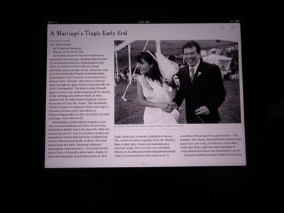 And so, the iPad2, which arrived a week ago, and which I have put to minimal, but interested use. I am a New York Times subscriber, for example, and so, by downloading the New York Times app, I can now sit with this glass tablet on my lap in the dark making no disturbing rustling noises while I read the reviews of such great books as Francisco Goldman's Say Her Name. I find it easier to read this way—my arms don't hurt, my eyes don't squint, and I can turn off the lamp beside my husband while he watches shows about fish, food, and war (sometimes he's lucky and all three things appear on one show at once). I'm reading my hometown paper this way as well, and when my subscription to the paper version of The New Yorker runs out, I may go iPad with that as well, though I don't know. I'm rather fond of my stacks of New Yorker stories, torn fresh from the bindings. Vanity Fair? Maybe.