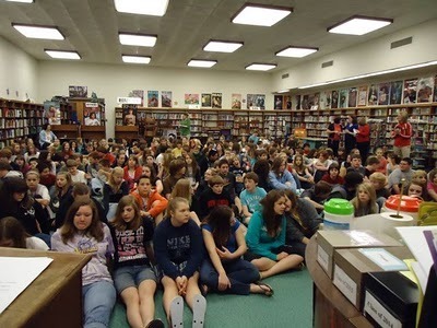 I loved reading the story, because I love the honesty of teens, and I love what happens when they gather within libraries. (The photo above, for example, was taken just ahead of a talk I gave in a Wisconsin school library earlier this year, and I was amazed by the buoyancy of those readers, by the questions they asked and the things they confessed to.) I love, too, how librarians and publishing houses are working together to fuel the fervency of the book-loving young.