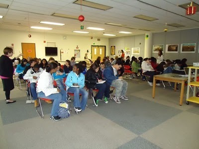 We created classified ads declaring our secret ambitions or yearnings (WANTED: Peace. WANTED: Fluency. WANTED: Summer freedom. WANTED: One more chance to say goodbye. WANTED: Sunday, Again. WANTED: Someone to look up to.). We identified those 2010 world phenomenon that, were the kids in charge of a contemporary world exhibition, would get top billing: Puerto Rican culture, iPads, student grades and grading systems, a slice of ocean, a sliver of mountains, the history of cancer treatment, a display revealing the history of computer technology, a peace congress, a collage of 2010 headlines from a multitude of media, a history of music. We talked about how books get made and why they are read. We talked about faith in the face of rejection. We talked about the kids' own writerly aspirations. We talked about birds. We talked about my character Anna's last word—the why of it, the impact. These were beautiful kids, with wholly invested teachers, and it was an honor to share my morning with them. It makes what I do so worthwhile.