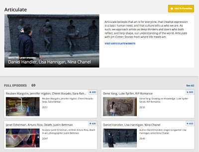 "Articulate" has evolved since then, inviting guests like Daniel Handler of Lemony Snicket fame, pianist Simone Dinnerstein, Lady Gaga's hat maker, Arturo Rios, and singer songwriter Lisa Hannigan into the studio or under the lights. For anyone who hopes to turn on the TV (or the internet) and find the reprieve of interesting talk, artful hope, and cinematic beauty (I don't know of any other arts show that is so beautifully produced), I strongly urge you to find Articulate.