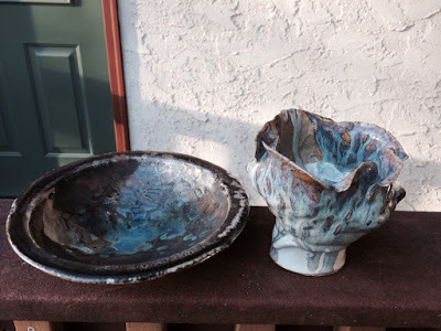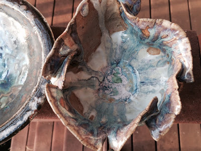 But such a pretty day it was, and so nice to be in the city among friends and a former student and kind strangers. And how nice to return home to three new kiln pieces, collected by my husband earlier in the day. As always, the organic shape is mine from scratch. The well-made bowls are well made by my husband, but glazed by moi.
