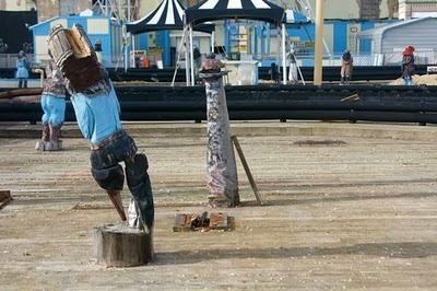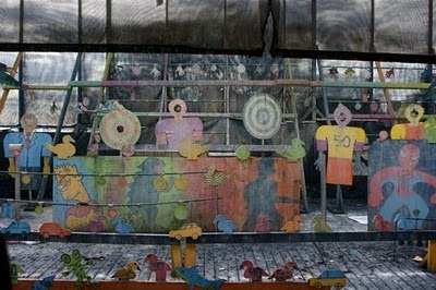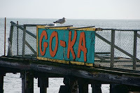 In Atlantic City on Thursday afternoon we happened on an old Go Kart track—stripped to the bones, awaiting restoration. Only the hob-legged pirates stood while just beyond them surfers rode the crash-waves by the pier.