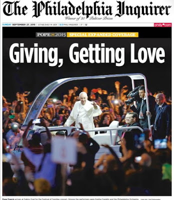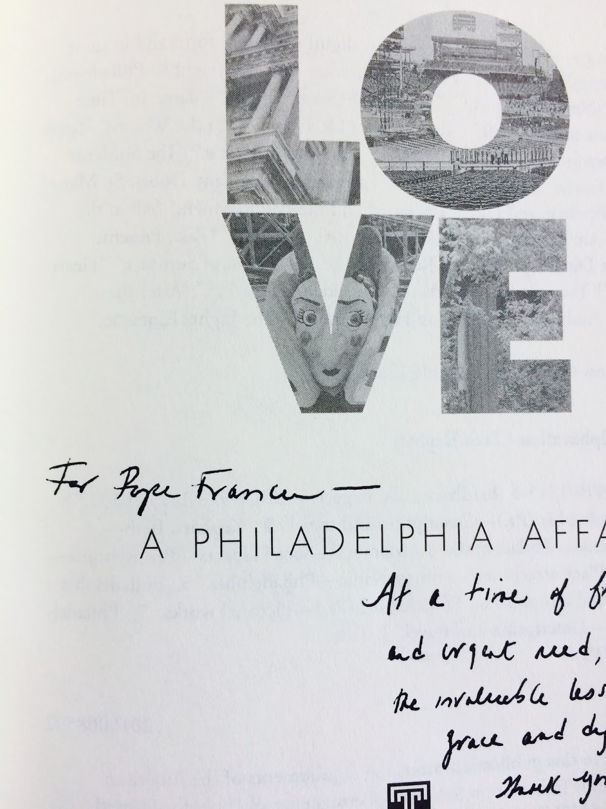He celebrates the immigrant, reminds those who must be reminded that we, here in America, we, here, in Philadelphia, are all products of movement; my own Italian great-grandfather became a naturalized citizen not even 100 years ago. He asks us to look past walls and barriers. To be honest with each other. To seek out peace, to stop perpetuating damage, to hold together family and family life.
