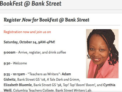 Before Jenny took on that new role, she designed the 2015 BookFest@Bank Street and extended the invitation I noted above. Featuring Rita Williams-Garcia in a keynote, the day will include insights from scholars and writers Leonard S. Marcus, Adam Gidwitz, Elizabeth Bluemle, Cynthia Weill, Christopher Myers, Shadra Strickland, Raul Colon, Sara Varon, Joe Rogers, Jr., Laura Amy Schlitz, Jeanne Birdsall, Kat Yeh, Liz Kessler, and Monica Edinger. BookFest will also feature a panel titled "Pushing Narrative Boundaries in Teen Literature," moderated by the reliably smart and provocative Vicky Smith, the reviews editor of Kirkus.