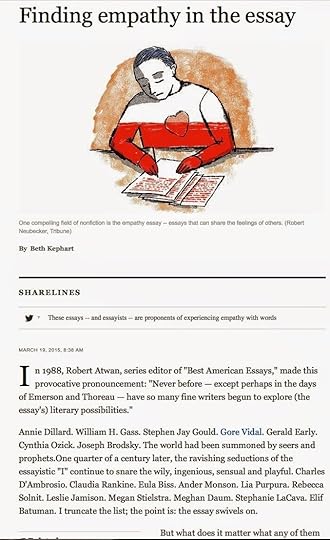 Perhaps because I just finished writing and sharing a piece (in today's Chicago Tribune) on the empathetic imagination, perhaps because I teach memoir largely because I believe that teaching memoir is (or can be) akin to teaching compassion, perhaps because I have lived in shadows, too, been attacked, yearned for intervening empathy, the first two Times pieces I read today were compassion invested. The first, titled "The Brain's Empathy Gap" (Jeneen Interlandi), reports on studies designed to answer questions like: "How much of our empathy is innate and how much is instilled in us by our environment?" and "Why does understanding what someone else feels not always translate to being concerned with their welfare?" I recommend the read.